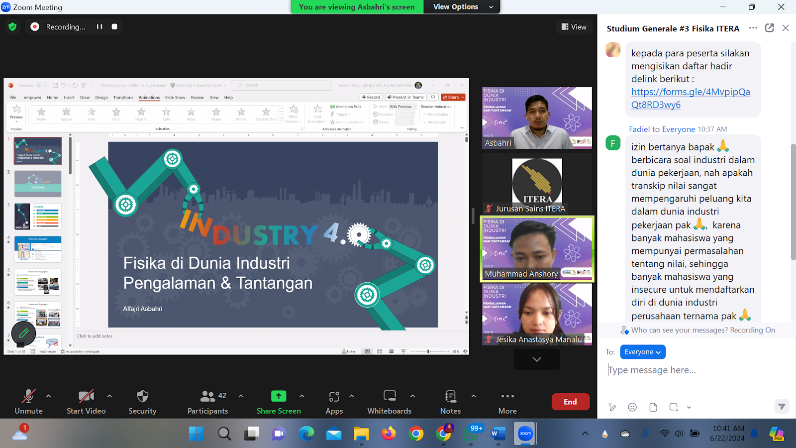 Pada hari Sabtu, 22 Juni 2024, Prodi Fisika, Fakultas Sains ITERA mengadakan Studium General Series 3 yang bertemakan “Fisika di Dunia Industri: Pengalaman dan Tantangan”