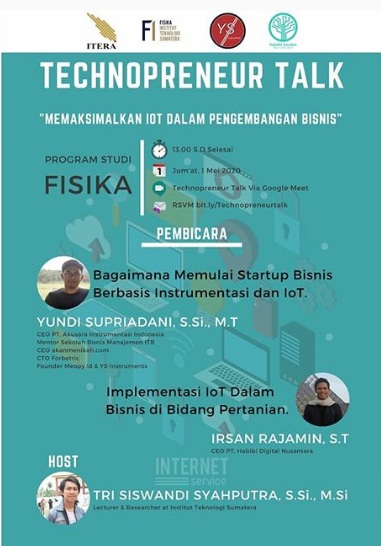 Prodi Fisika Institut Teknologi Sumatera telah menyelenggarakan Diskusi Online TechnopreneurTalk “Implementasi Instrumentasi dan IoT dalam pengembangan bisnis” pada hari Jum’at, 03 mei 2020. Kegiatan yang dilaksanakan secara online melalui aplikasi google meet ini bertujuan untuk meningkatkan pengetahuan mahasiswa tentang Instrumentasi dan IoT, selain itu peserta dapat memahami aplikasi Instrumentasi dan IoT di dalam berbisnis dan […]