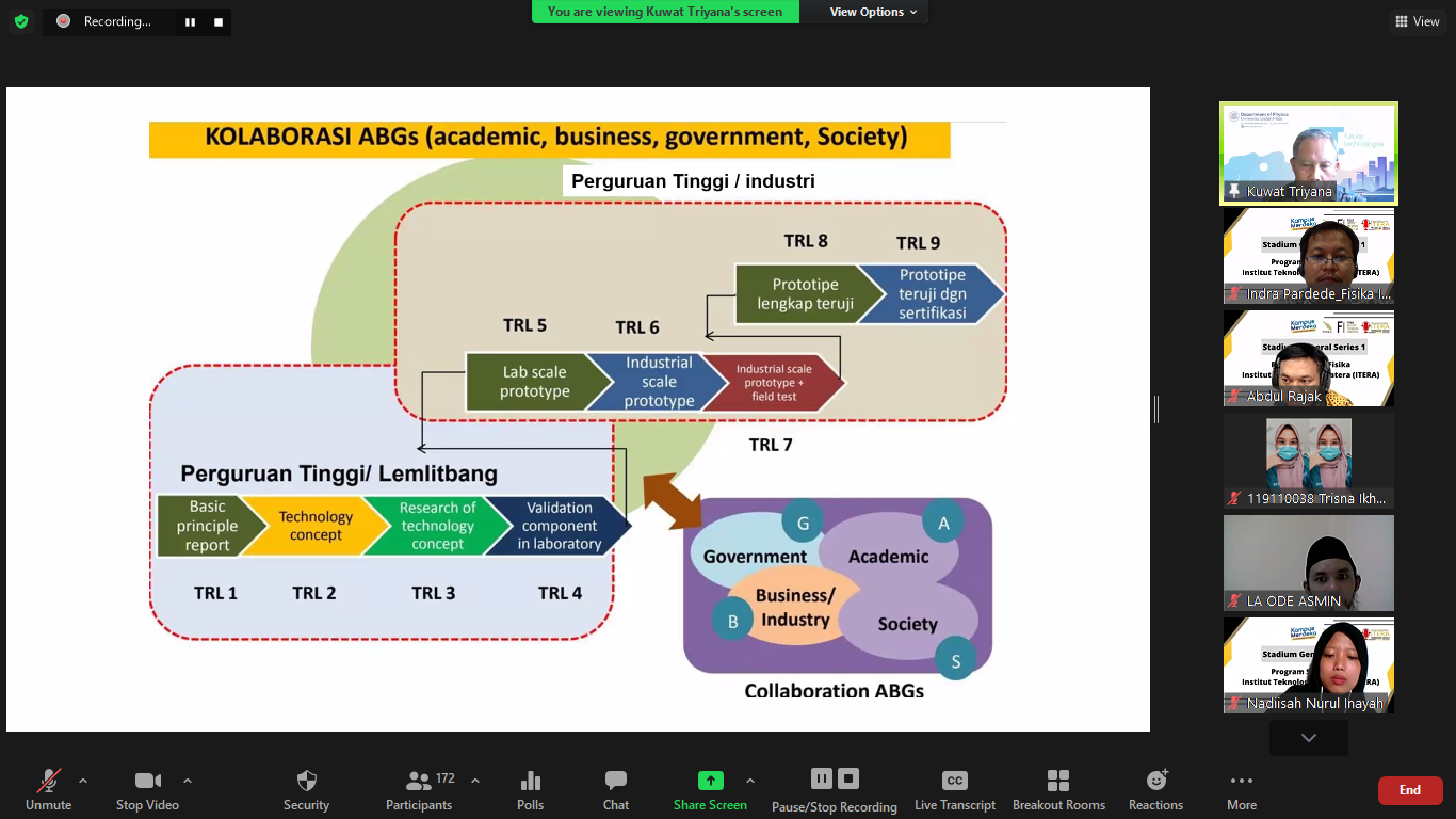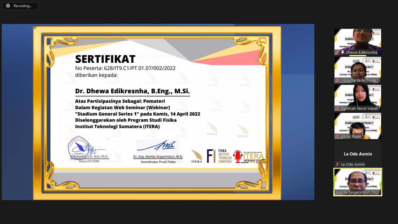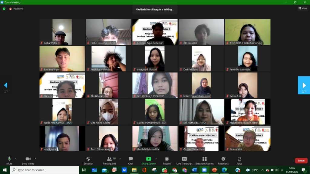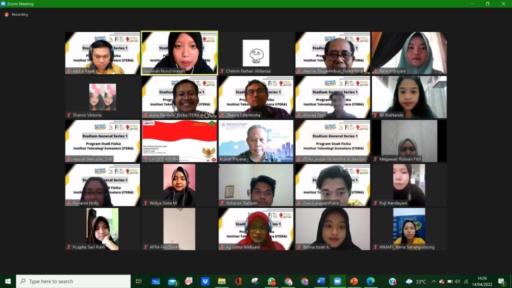 Pada Kamis, 14 April 2022 Program Studi Fisika ITERA mengadakan rangkaian Stadium Generale Series. Pada kesempatan kali ini pembicara yang diundang dalam gelaran acara SG kali ini adalah Bapak Prof. Dr. Eng. Kuwat Triyana, Ph.D dari Universitas Gadjah Mada dan Bapak Dr. Dhewa Edikresnha, B.Eng., M.Si. dari Institut Teknologi Bandung.