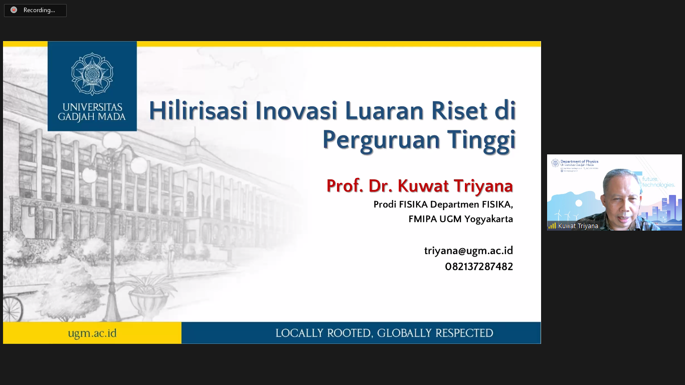 Untuk pemateri yang pertama adalah bapak Prof. Kuwat Triyana, beliau merupakan Dekan FMIPA UGM. Pada awal penyampaian materi Prof Kuwat memaparkan materi mengenai Hilirisasi inovasi luaran riset di Perguruan Tinggi.