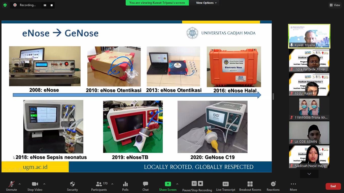 Prof Kuwat menjelaskan sebenarnya inovasi dalam penelitian tidak perlu dimulai dari topik yang berat, contoh kasus penggunaan indra yang bisa dimodelkan dari material fungsional dan komputasi, contohnya pengembangan sensor electronic nose yang kini digunakan secara masal dalam uji Covid-19.