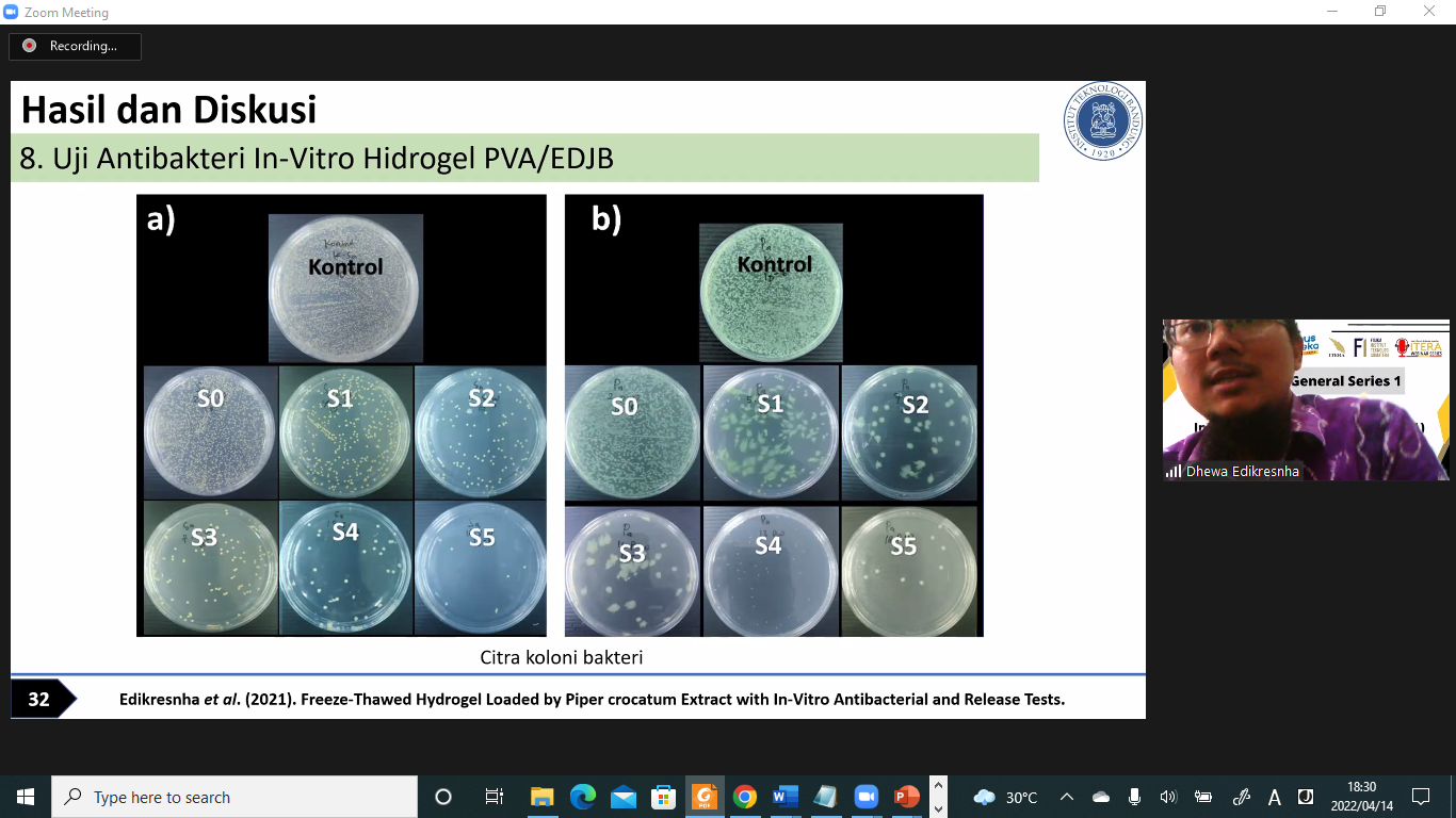 Pemateri yang kedua disampaikan oleh Pak Dhewa yang memaparkan riset yang pernah beliau kerjakan yakni tentang pembuatan hidrogel yang termuati ekstrak bahan alam sperti sirih merah dan daun jambu biji, dengan salah satu aplikasinya adalah penyembuh luka.